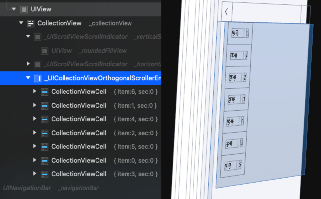 orthogonalScrollingBehavior 的默认值是 .none,当我们将其设置为其他值后,系统就会在 UICollectionView 上添加一层类型为 _UIOrthogonalScrollView 的 UIScrollView 子类作为 Cell 的父视图,如下图所示:
