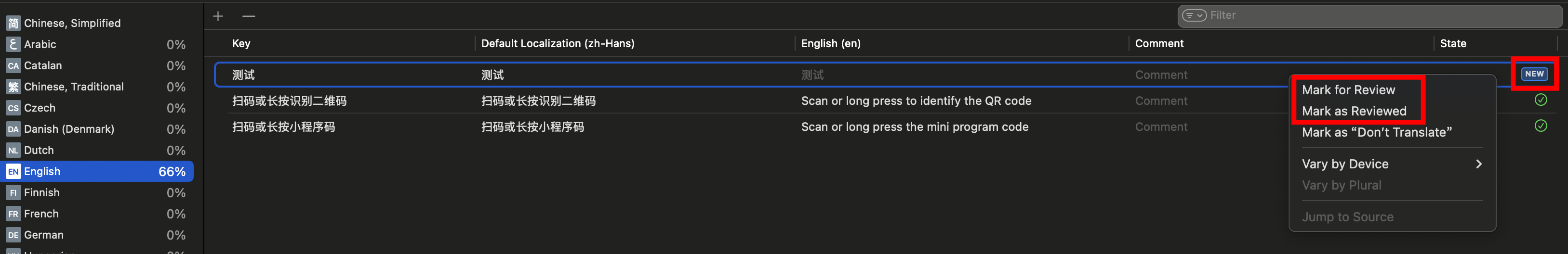 另外,就算文言处于 NEEDS REVIEW 状态,只要包含了对应的翻译,那么该翻译也是可以正常显示的。不过从字面上来看这一行为有些危险,稳妥起见建议开发者确保所有文言无误后,将其标记为 Reviewed 后再使用。