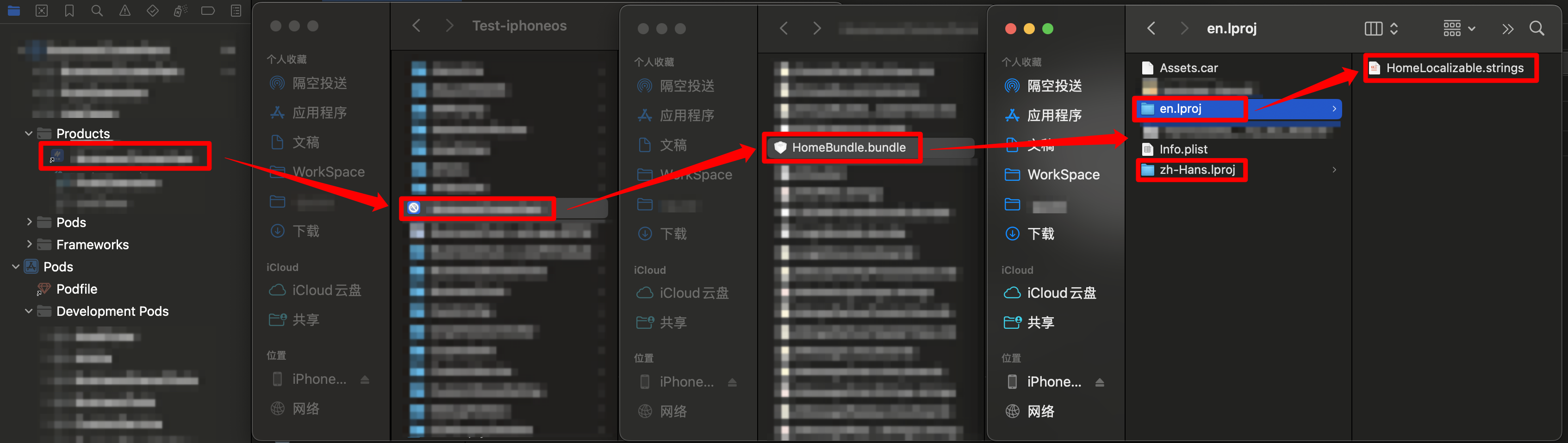 如果你好奇为什么使用老的 NSLocalizedString api 也可以,那么我们可以先 build 编译一下项目,然后在 Products 目录找到编译好了之后的应用,最后找到 HomeBundle.bundle。