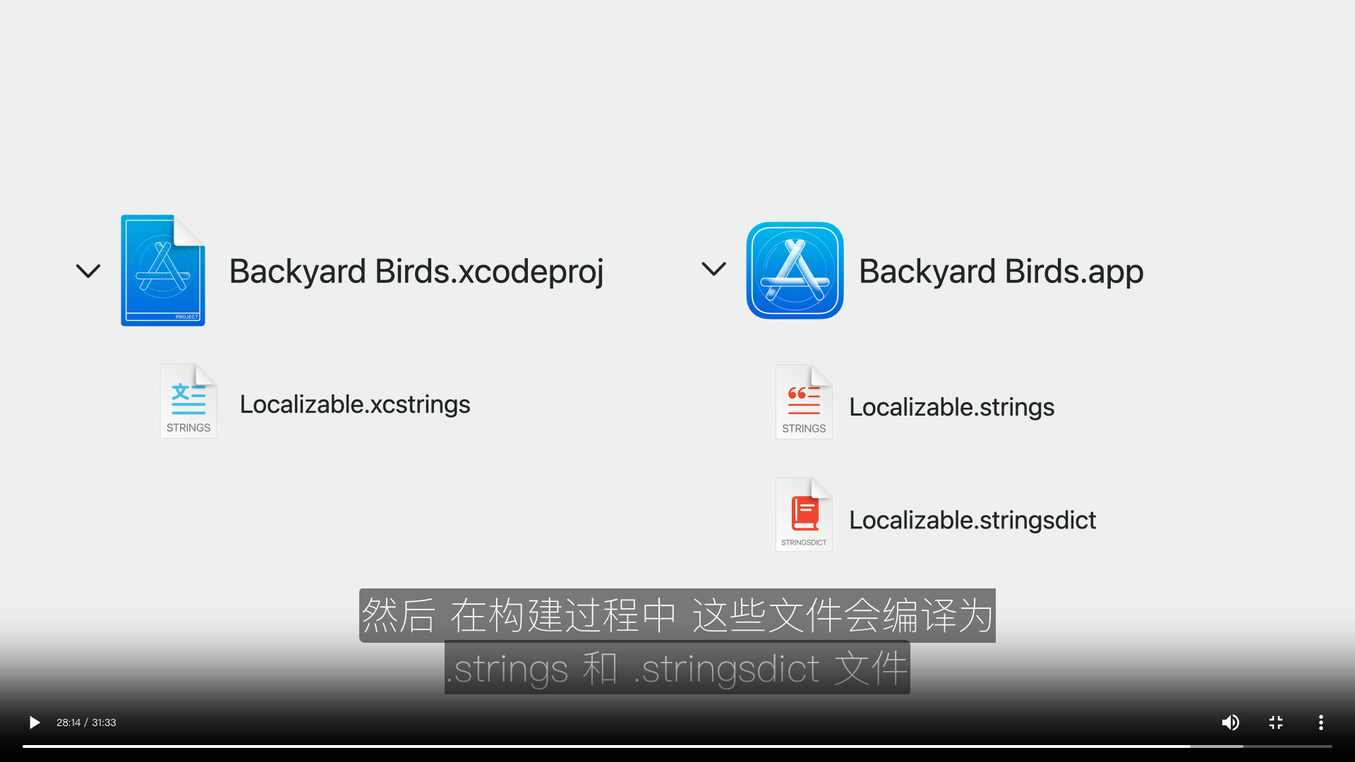此时你就会发现,.xcstrings 虽然不像是 .bundle 一样是一个 “包”,但是在编译时,它会被编译为和 .xcstrings 同名的 .strings 文件,所以我们依然可以使用 NSLocalizedString api 来读取相关设置,这点在 WWDC 的视频中也有相关说明: